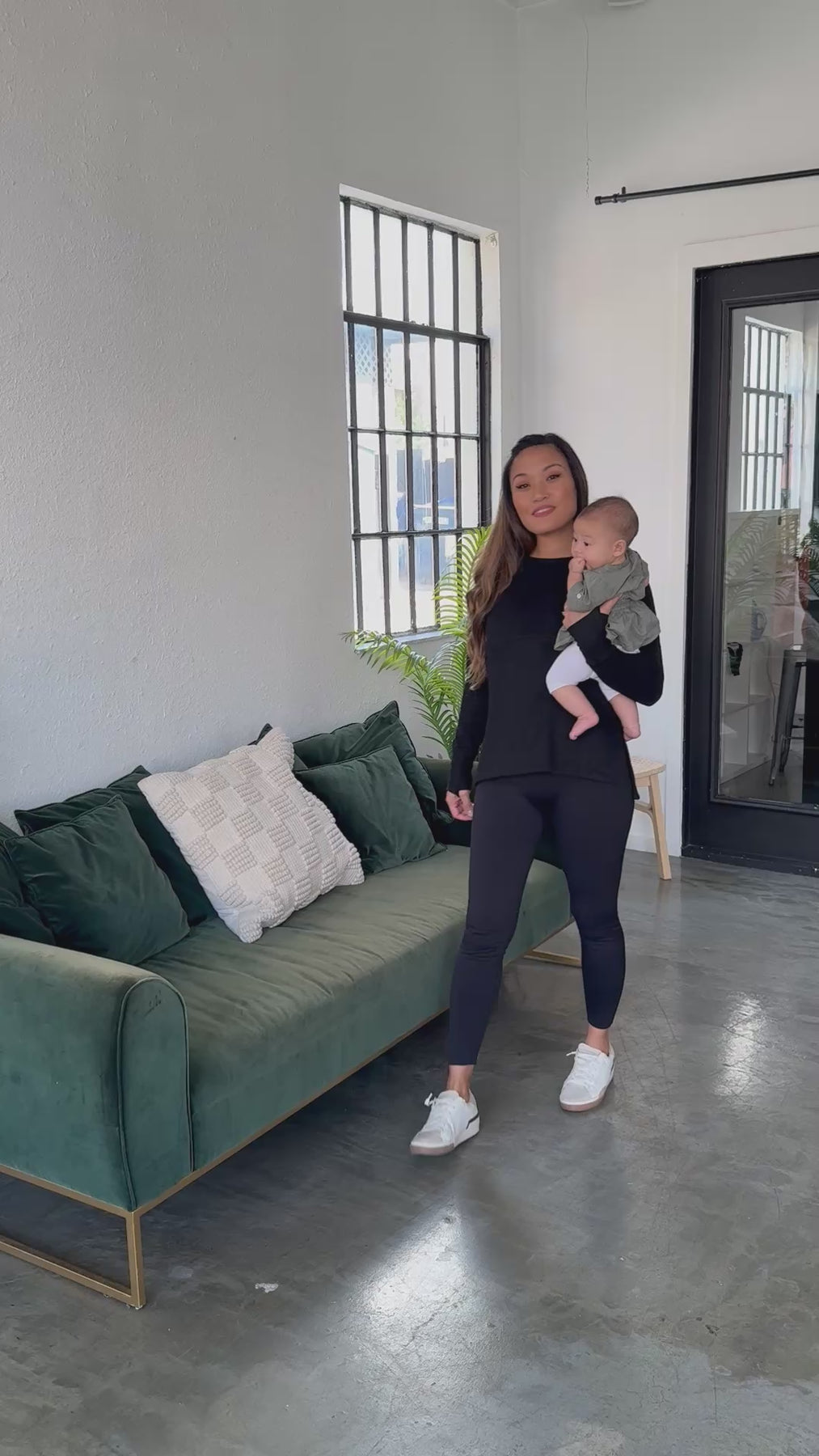This nursing sweatshirt has become a bestseller and continues to sell out! It was inspired by a leading yoga brand. It's long enough to wear with leggings, comes with side slits, is longer in the back, has ribbed material on the thumbholes and the collar.