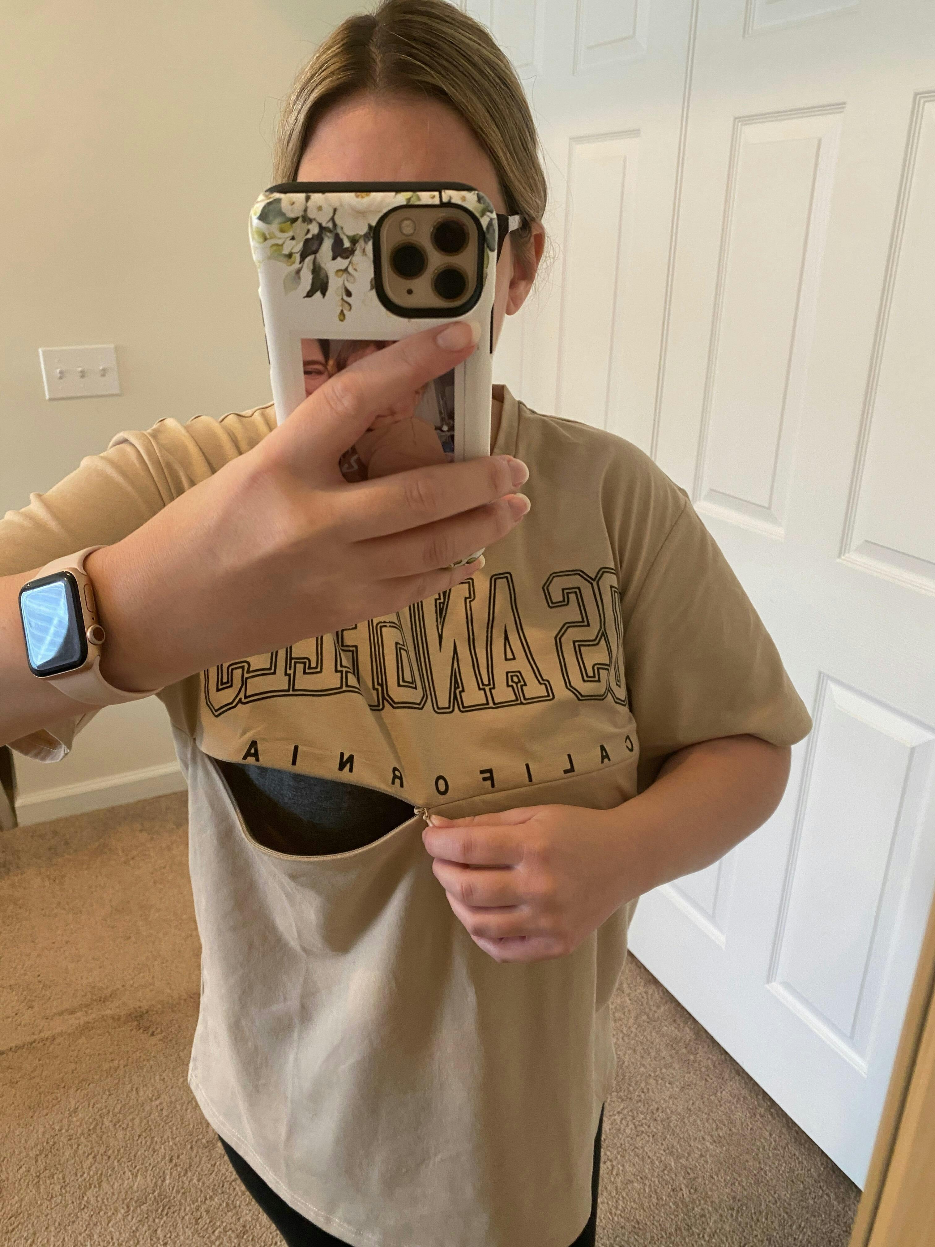 Christine E Nursing queen graphic tees are my new favorite thing! An oversized tee and leggings is basically my mom uniform, but lifting up my tshirt every time I need to nurse (which is a lot due to having twins), was getting really old. This tshirt is so cute, comfortable and easy to use! The nursing access hits at the perfect spot and the zipper slides easily. For reference, I’m 5’3” and currently 150lbs and 5 months post partum. I’ve bought a size medium in another tee and a small in this one and the small fits best.