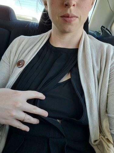 Actually really love this top. The peplum helped hide my belly but still gave me curves and the pump access is so convenient and hidden. You would never know the zippers were there. Great shirt.