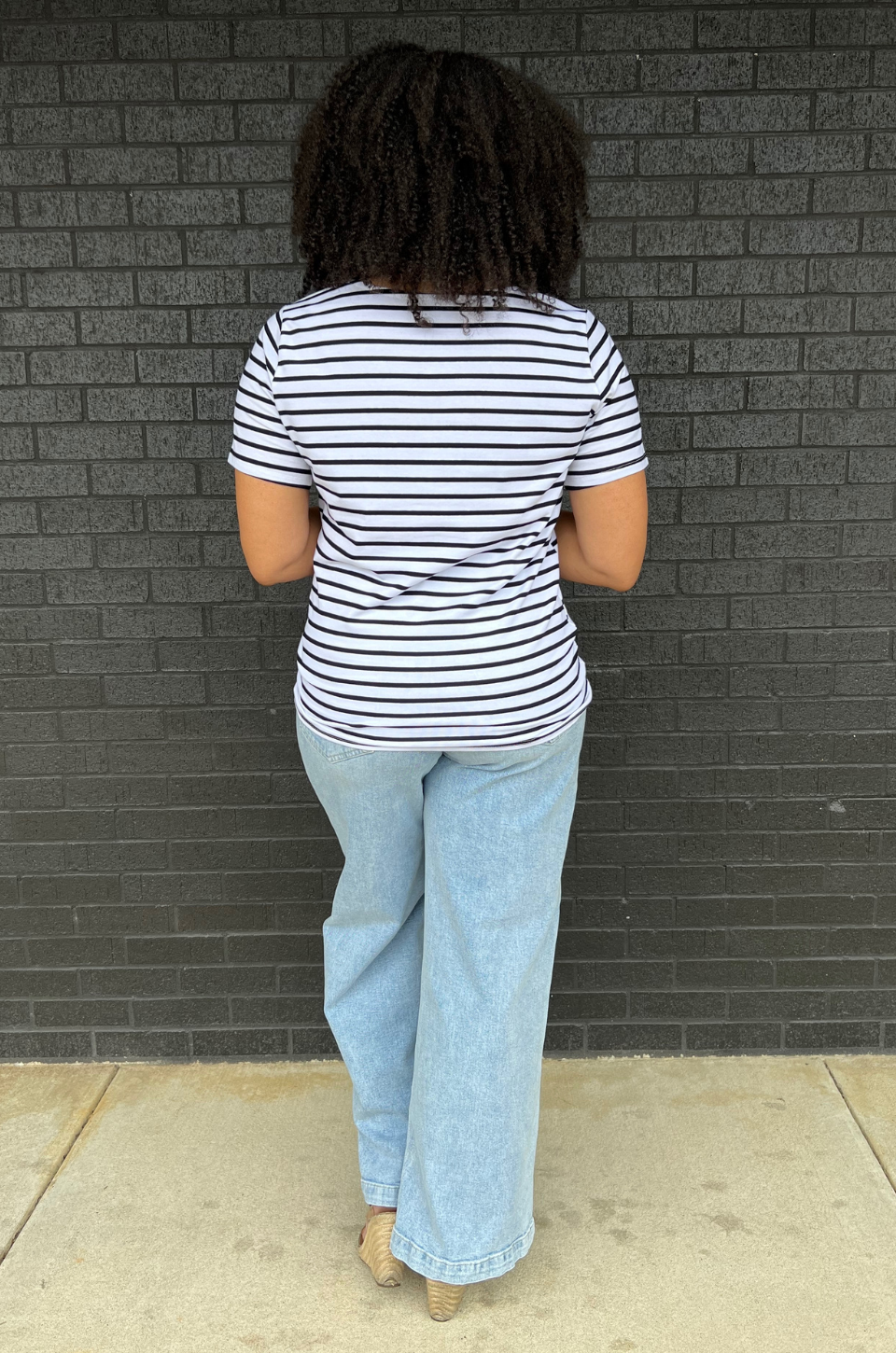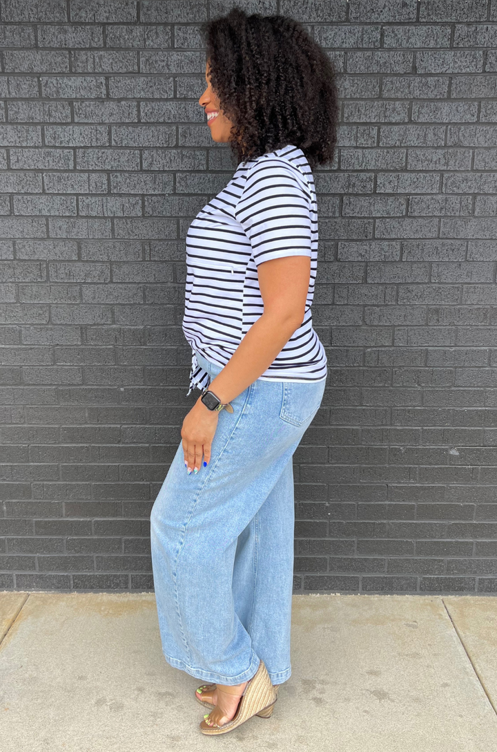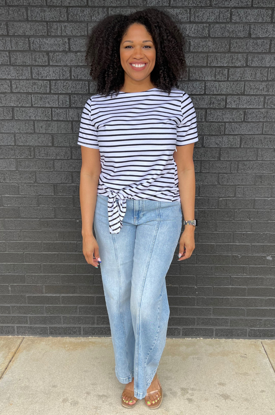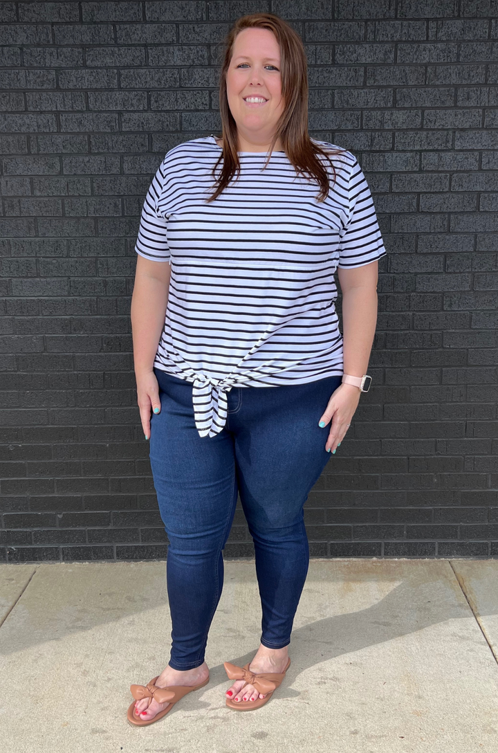 Our BEST-SELLING striped nursing tee is made with the same fabric as our 3/4 sleeve nursing top. We just added a cute front tie!