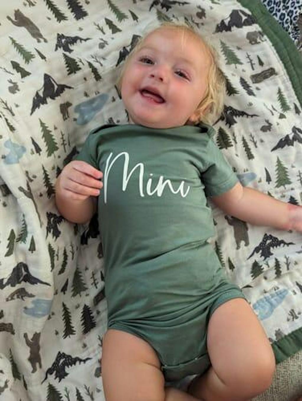 Close-up of cursive “mini” text on matching baby shirt in green.