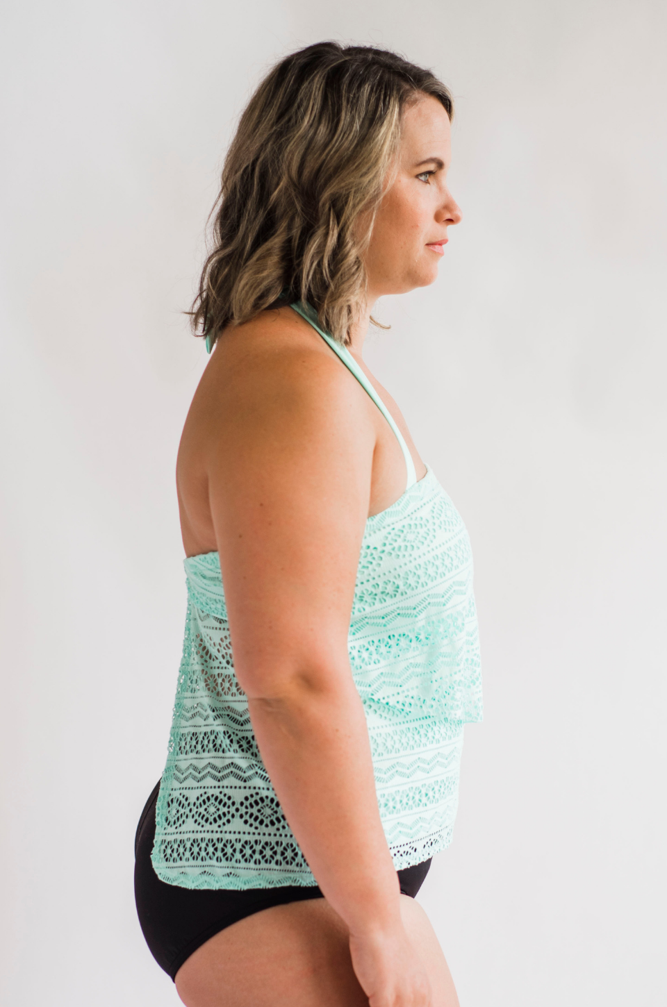 These nursing-friendly swimsuits have beautiful lace detailing covering the front of the tankini and come in three different colors: black, pink, and mint green.