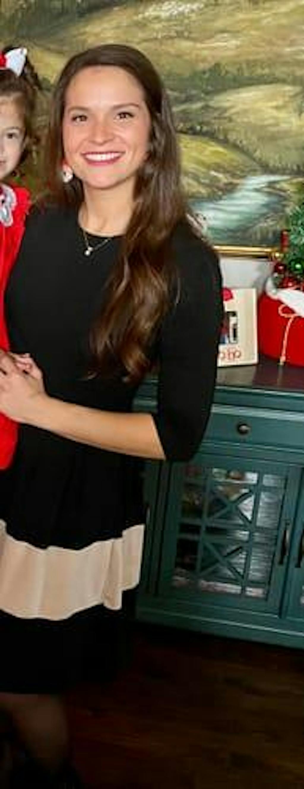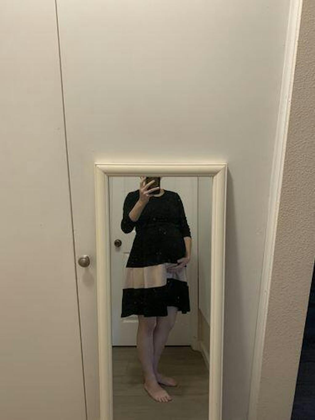 Front view of black fit and flare breastfeeding dress with tan stripe detail and concealed breastfeeding access.