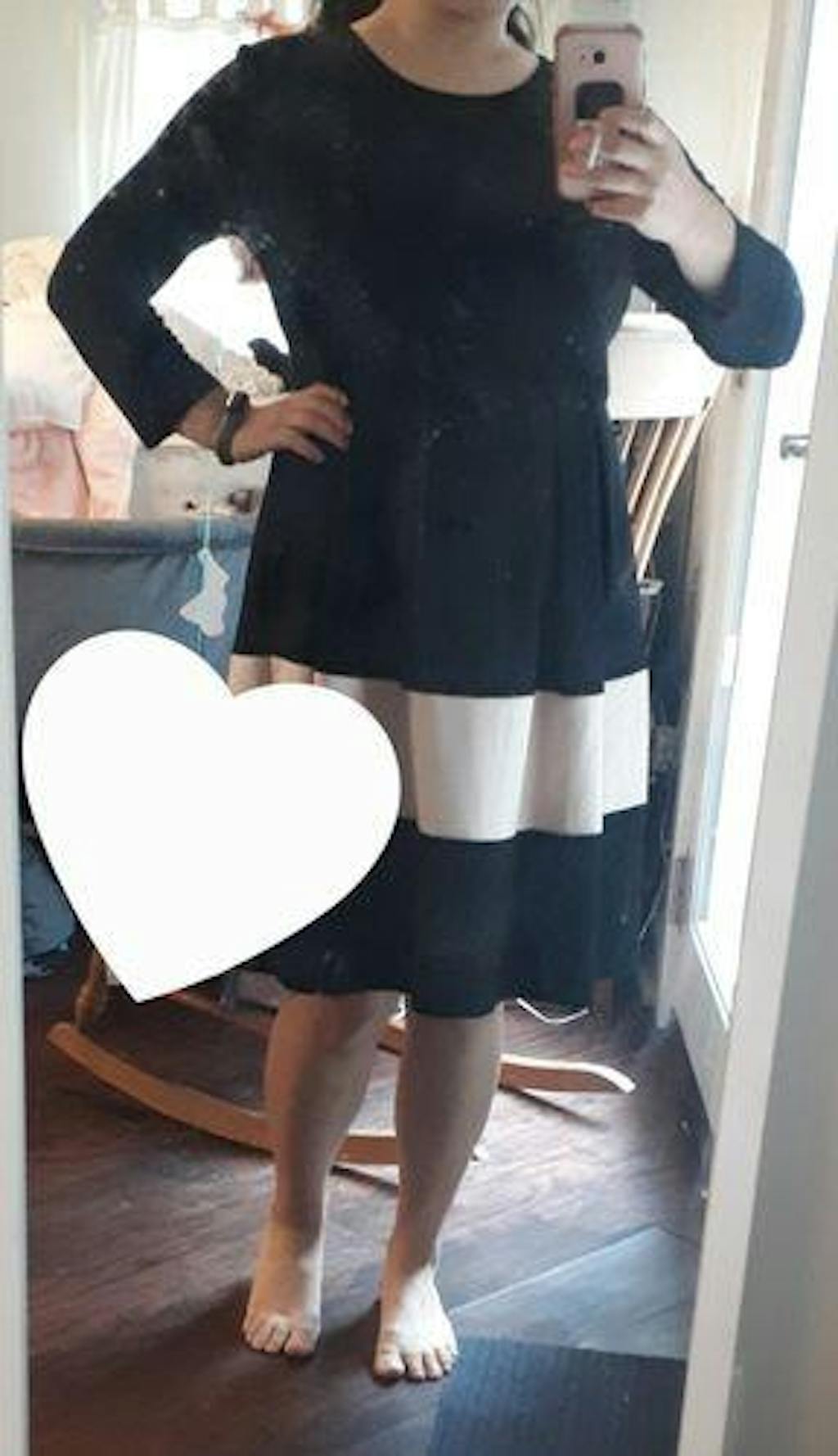 The black nursing dress is 95% polyester and 5% spandex, a blend that offers durability and excellent shape retention. Machine-wash the dress, and hang to dry.