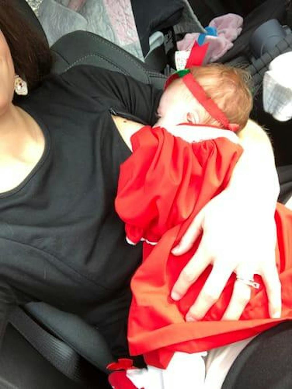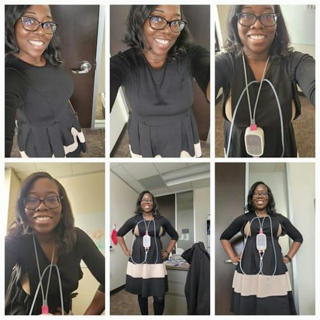 The black nursing dress includes vertical concealed zippers on the chest area, disguised as bust darts. The zippers enable effortless nursing and pumping for the mom on the go!