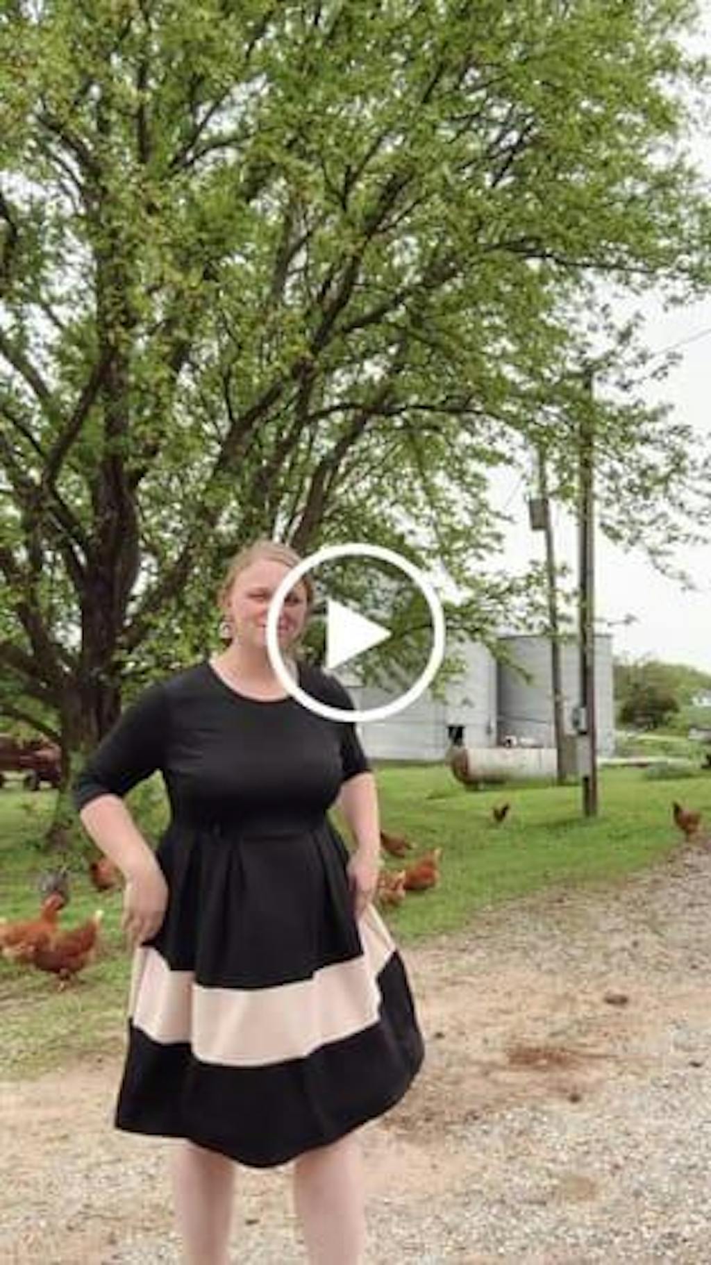 Video showing a breastfeeding mom wearing the black fit and flare nursing dress with tan stripe, demonstrating how the concealed breastfeeding access opens and closes