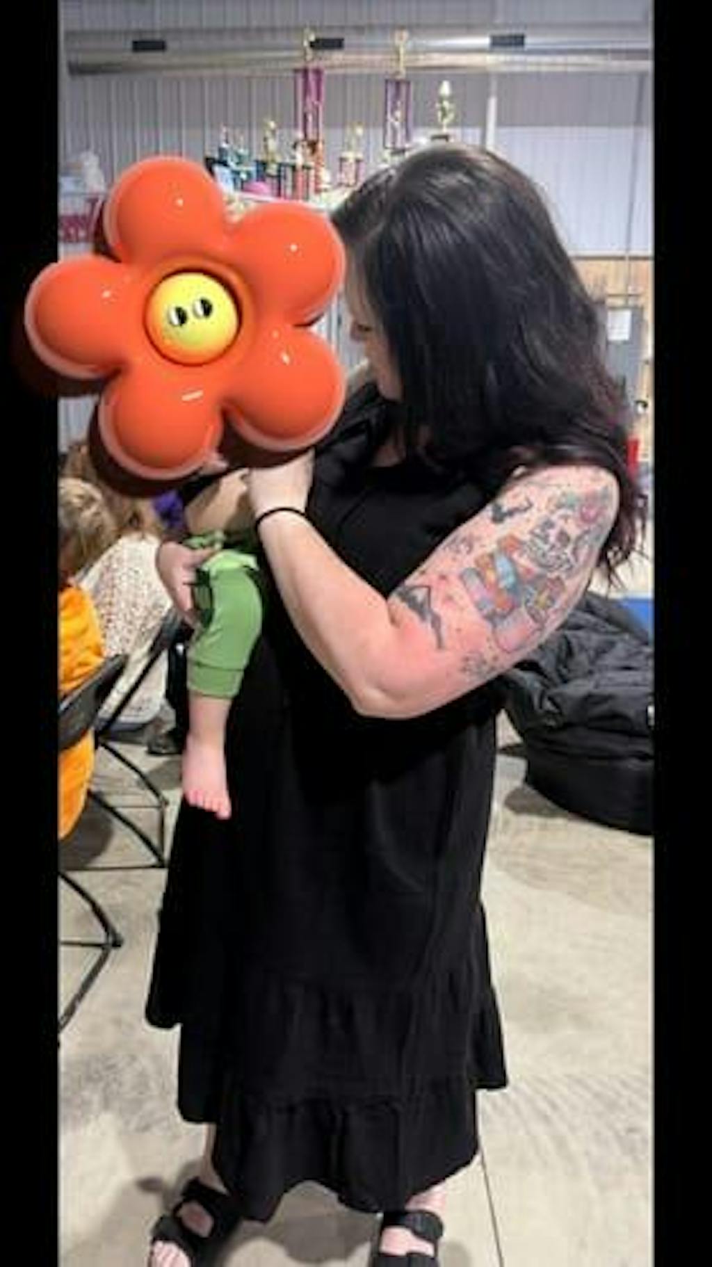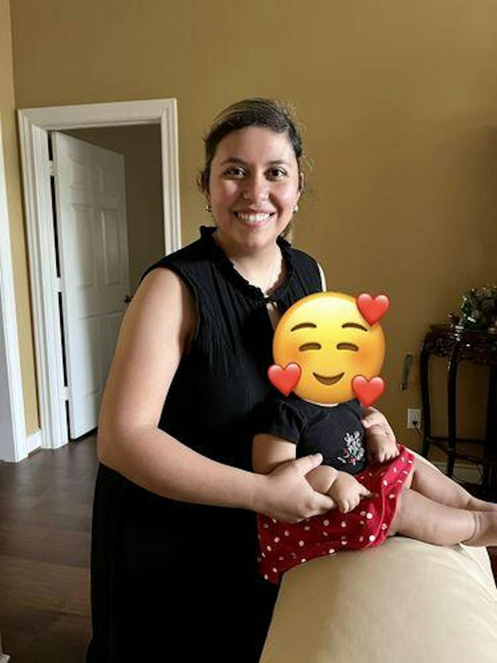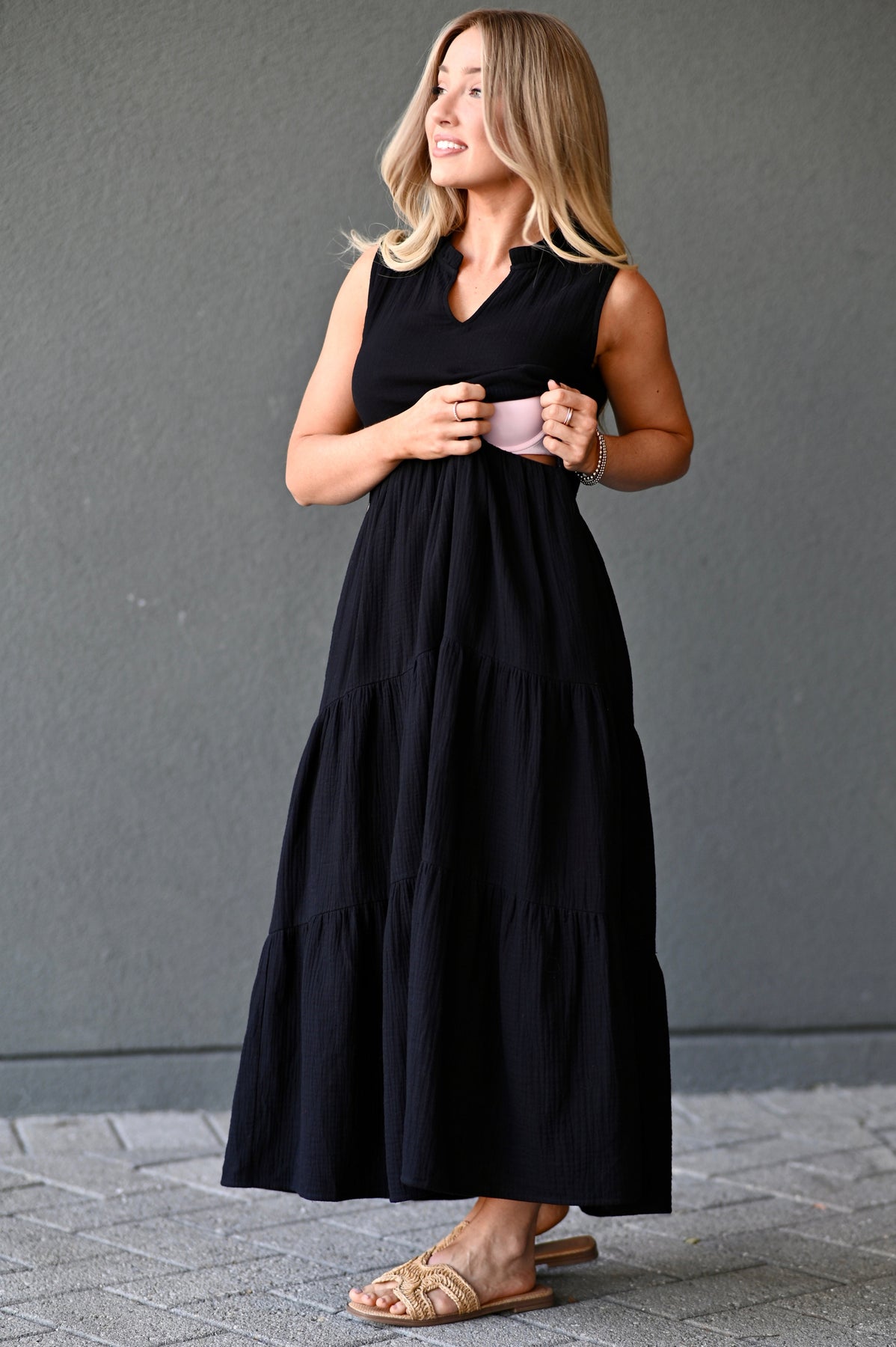 Woman wearing a black, cotton sleeveless nursing dress with hidden access for breastfeeding.