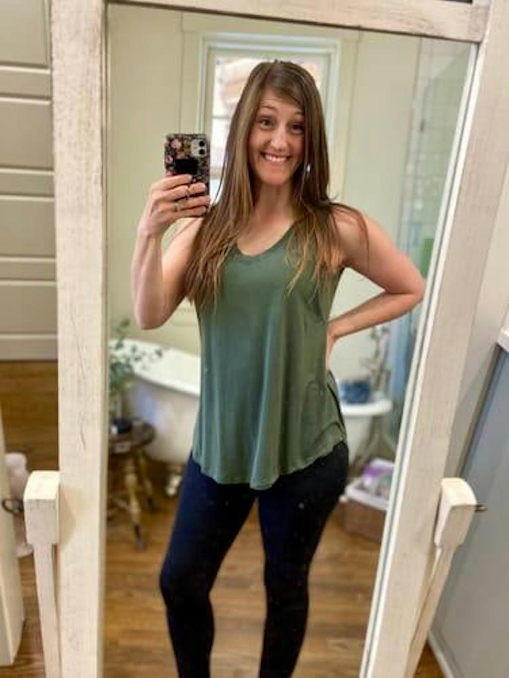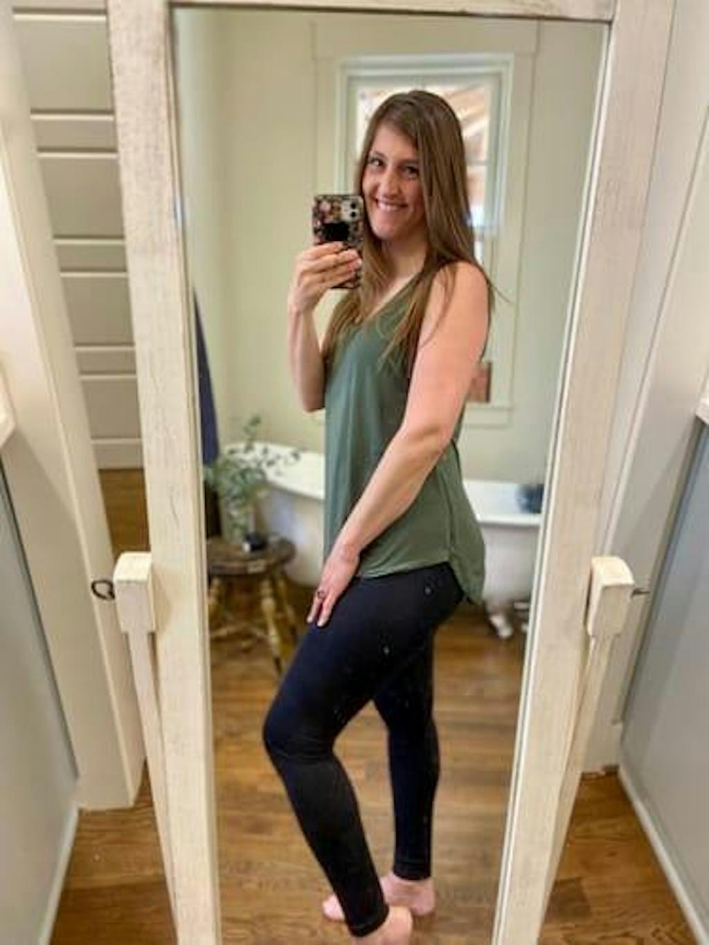 AMAZING top! The fit is so flattering while still carrying extra baby weight, the color is my favorite green, and the breastfeeding access is tastefully hidden! Plus the back is longer for modesty’s sake. I love it so much I want to order it in black too! Such a great design!