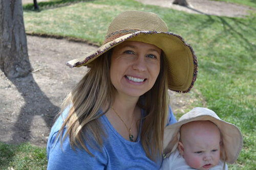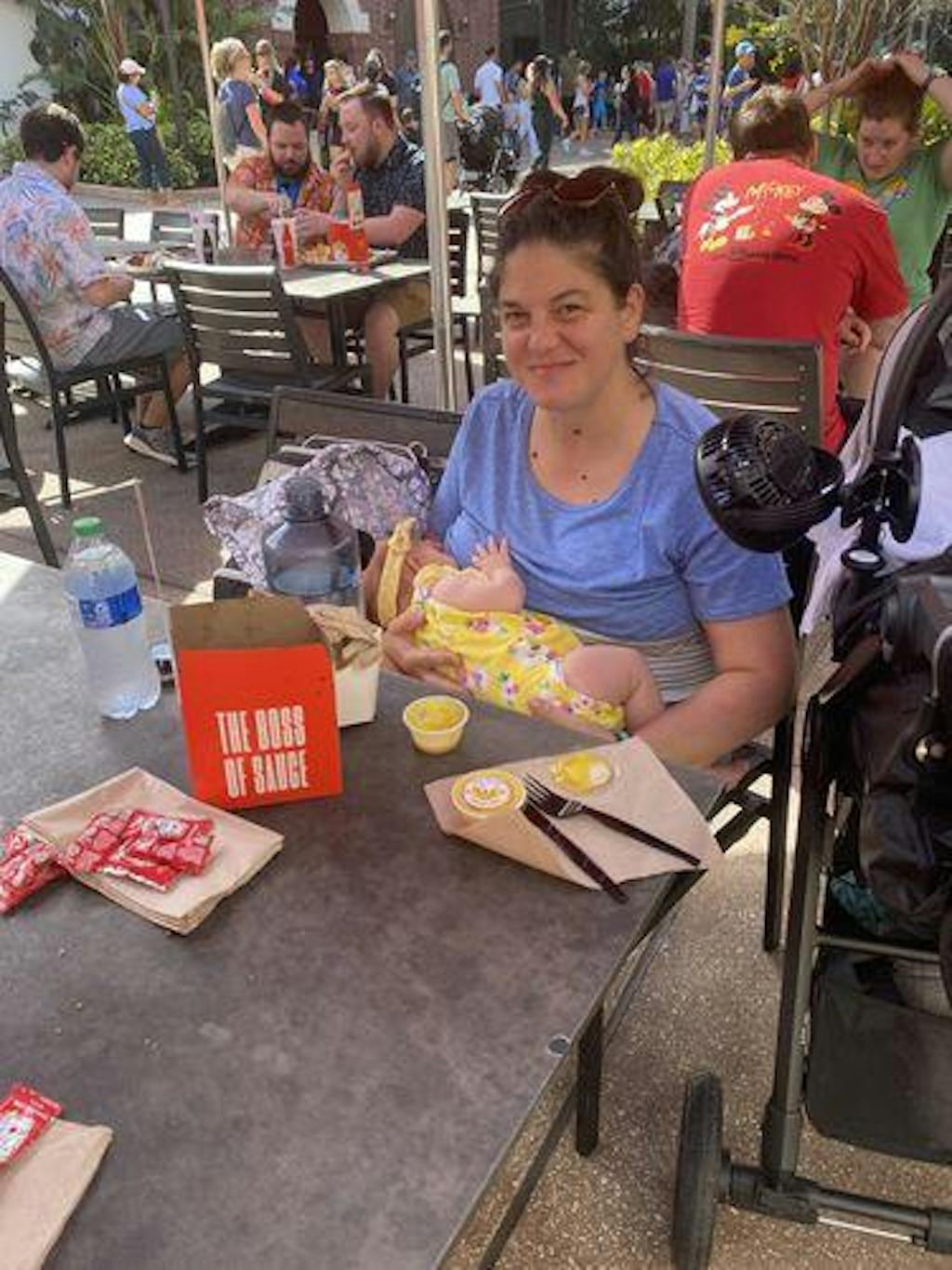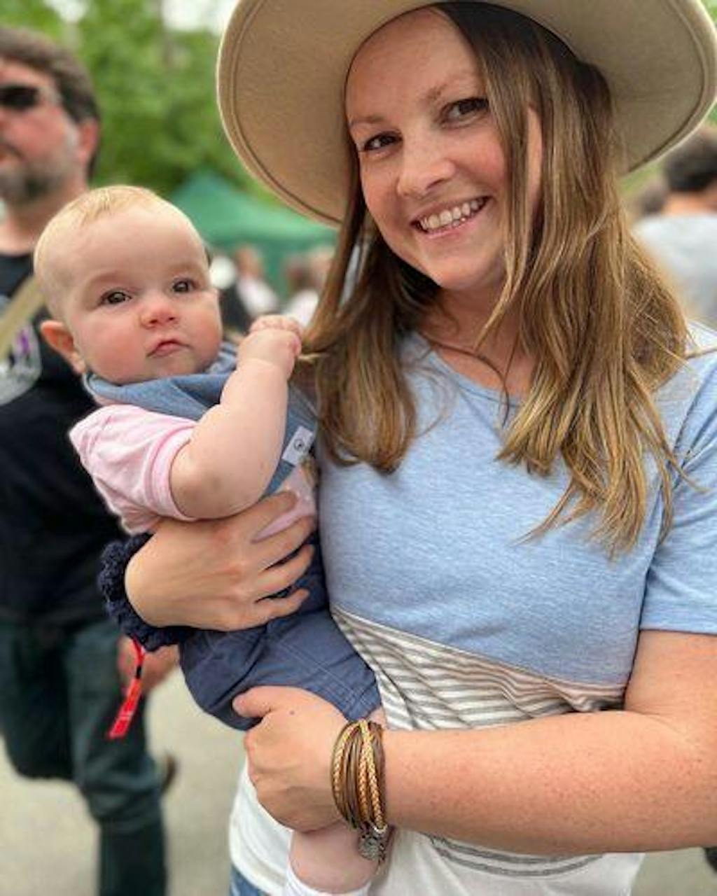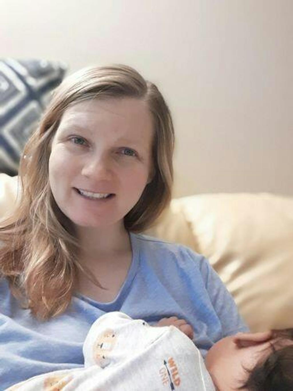 A mom wears the blue 3-block colorblock breastfeeding t-shirt to demonstrate a relaxed, true-to-size fit.