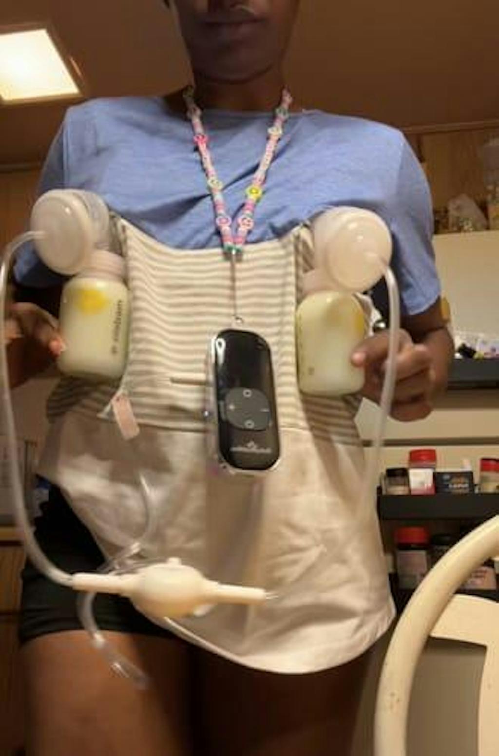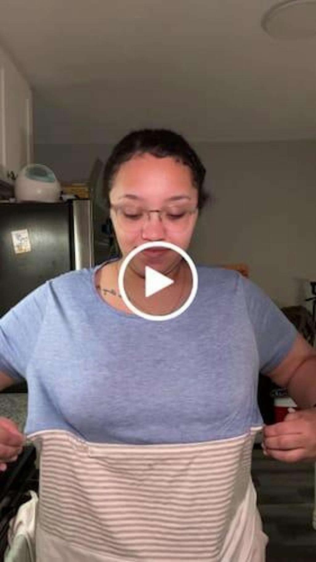 A video shows a mom demonstrating how the hidden zipper breastfeeding access works on the blue 3-block colorblock t-shirt for nursing and pumping.