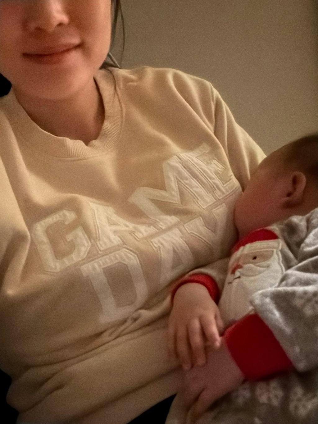 Mom and baby in Game Day nursing sweatshirt