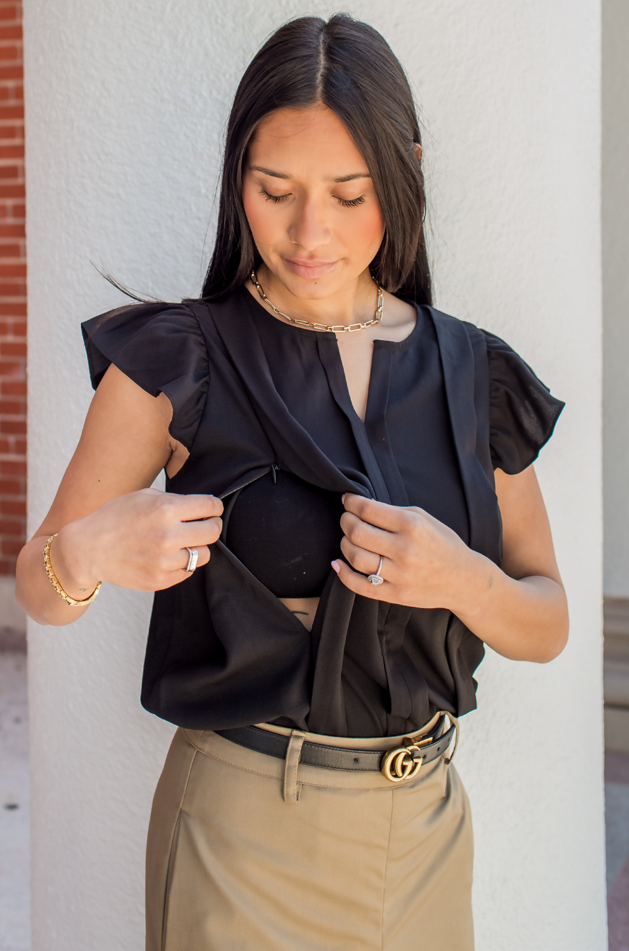 Pregnant woman wearing black maternity nursing blouse, showing fit designed for pregnancy with concealed zipper access for nursing.