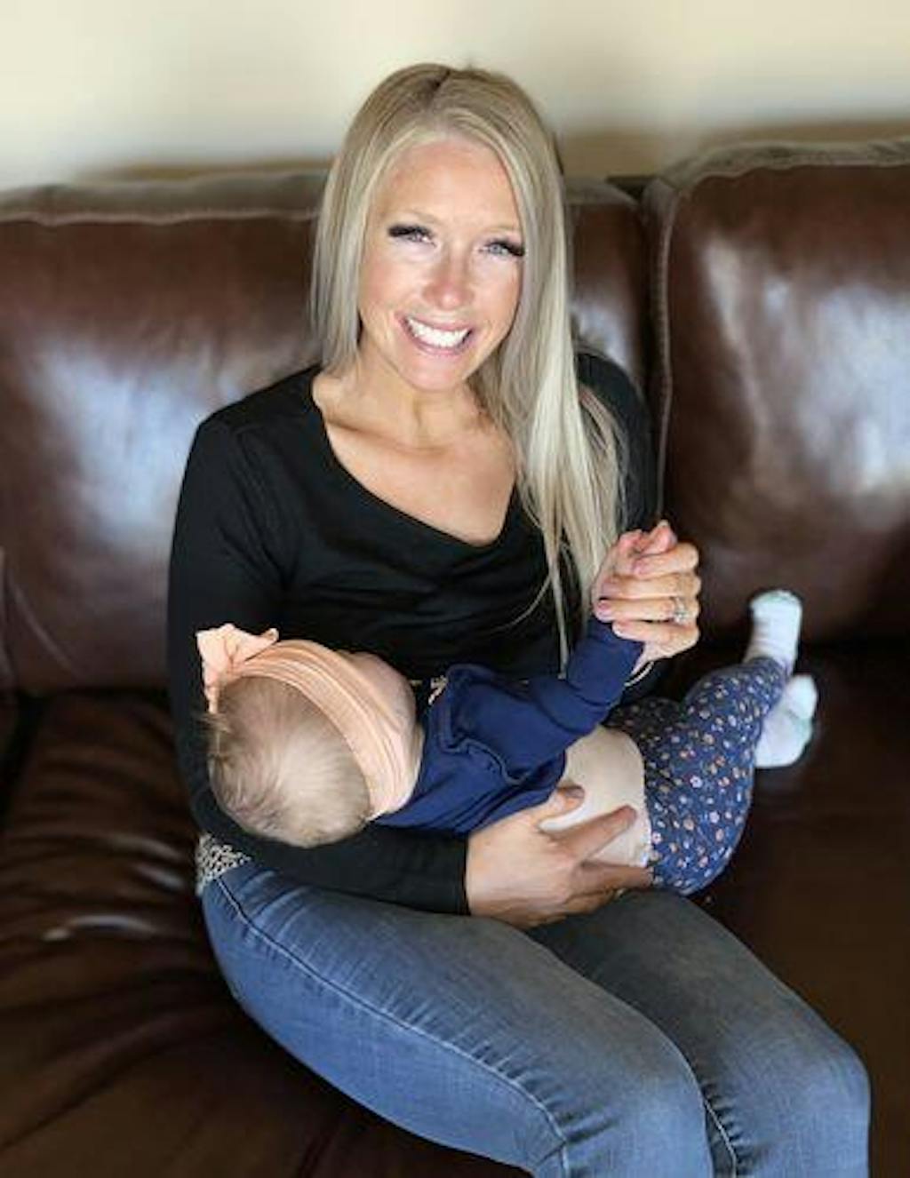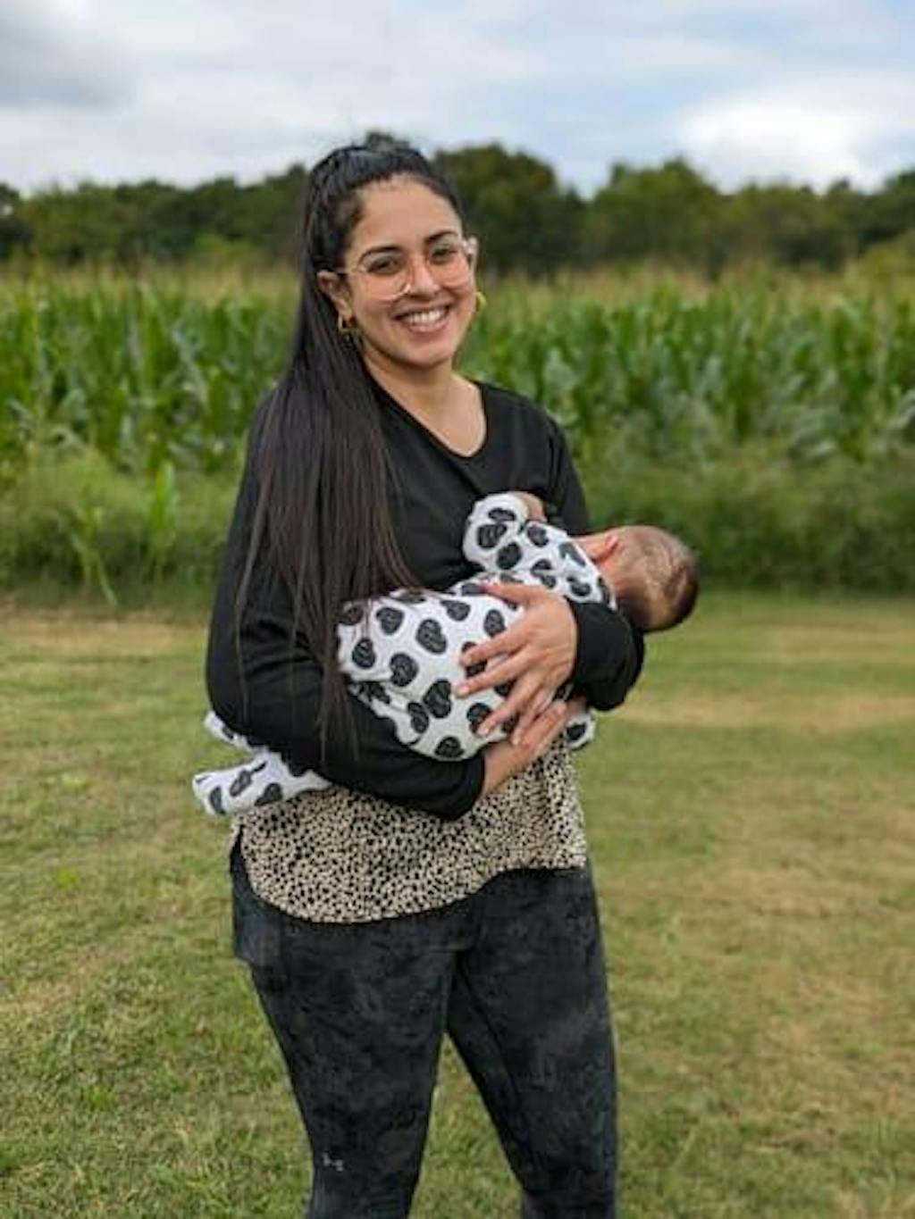 Front view of mom wearing the black leopard print double layer nursing sweater while holding a baby, showing layered breastfeeding access.