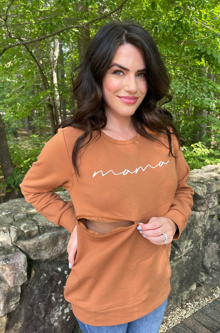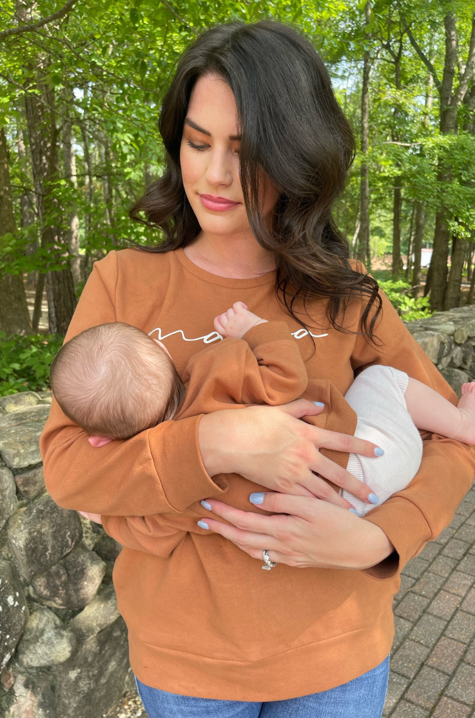 Wearing this ALL the time! So cute with jeans, nice and lightweight but still warm and good nursing access. I’m always happy when I can find mother SON matching clothes too! He looked adorable in the mini sweater. Size up for baby
