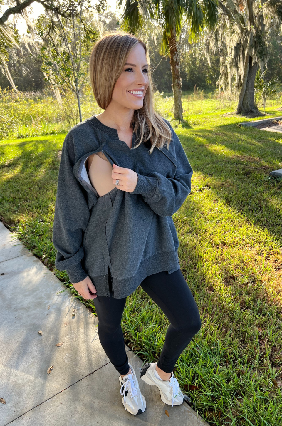 NURSING ACCESS: This sweatshirt has two slant zippers that are hidden along the upper chest seams.