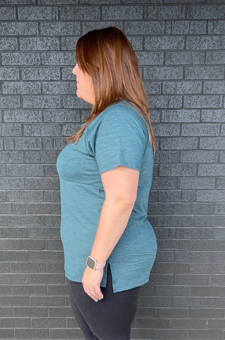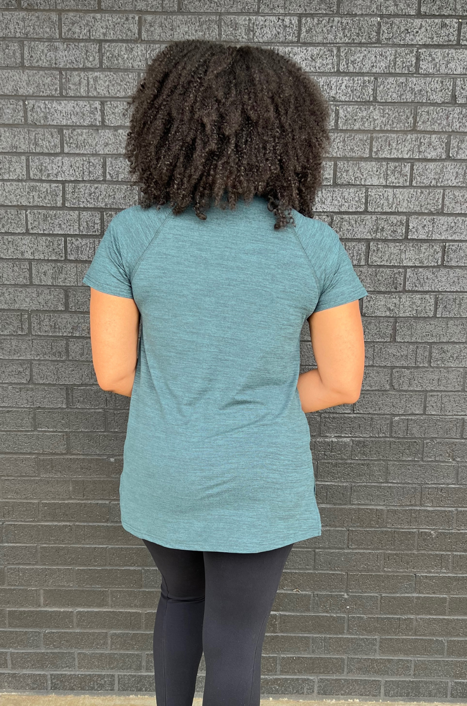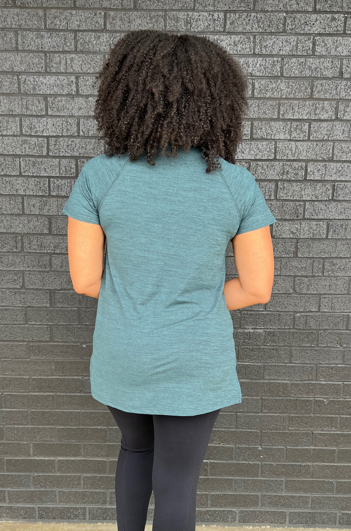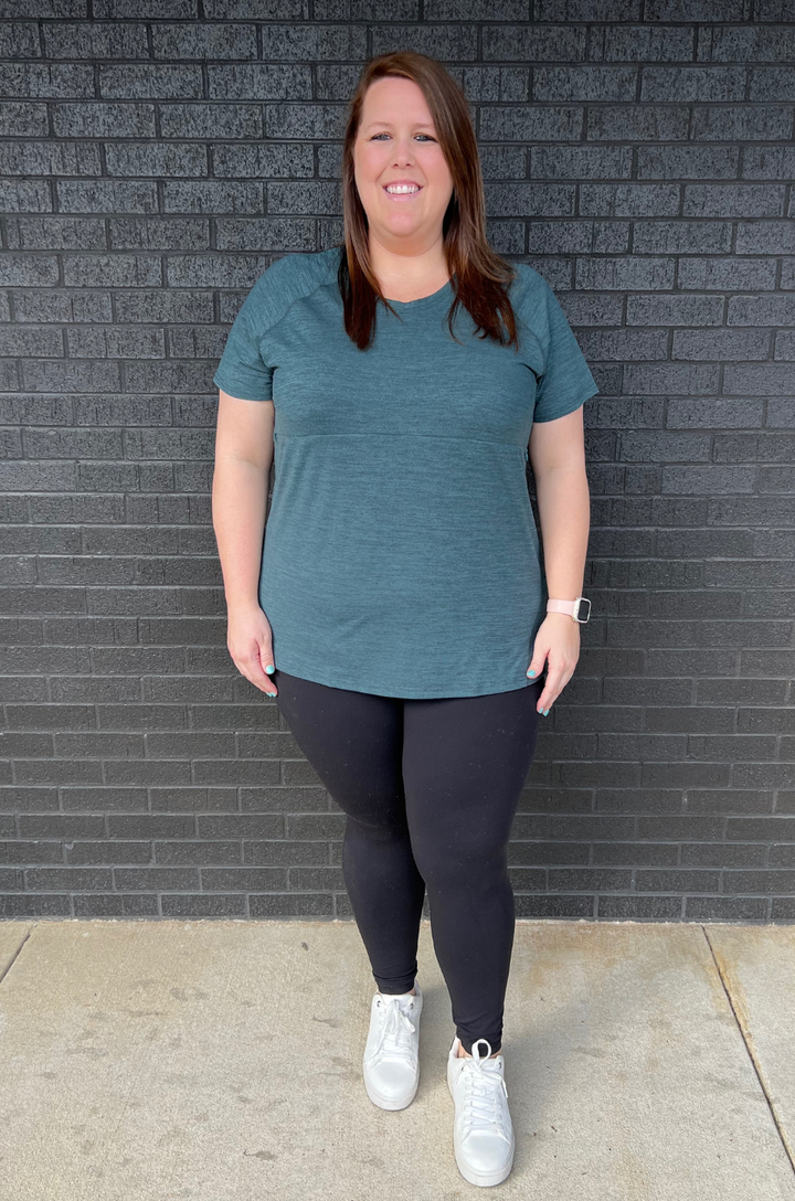 Finally a loose-fitting, short sleeve workout top with a nursing opening that's hidden! Moisture-wicking, V-neck, long length, and super flattering! This 2.0 version has a new softer fabric!