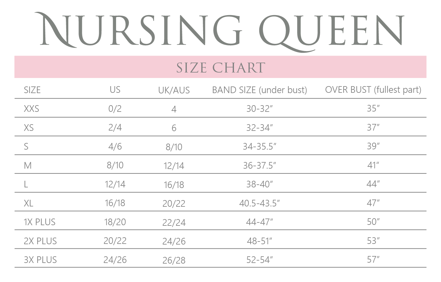 We follow a standard U.S. sizing chart and carry sizes XXS-3X (our plus sizes range from 1X-3X). Note: An XXL (in misses) is a size 1X in plus sizing. If you have any questions, please feel free to reach out at help@nursingqueen.com
