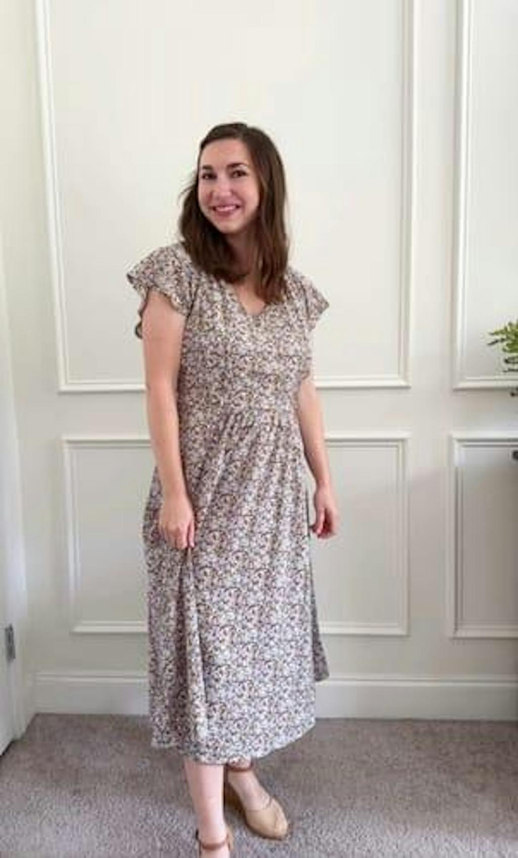 A video demonstrates the hidden zipper breastfeeding access and flattering fit of the beige floral belted midi dress with pockets.