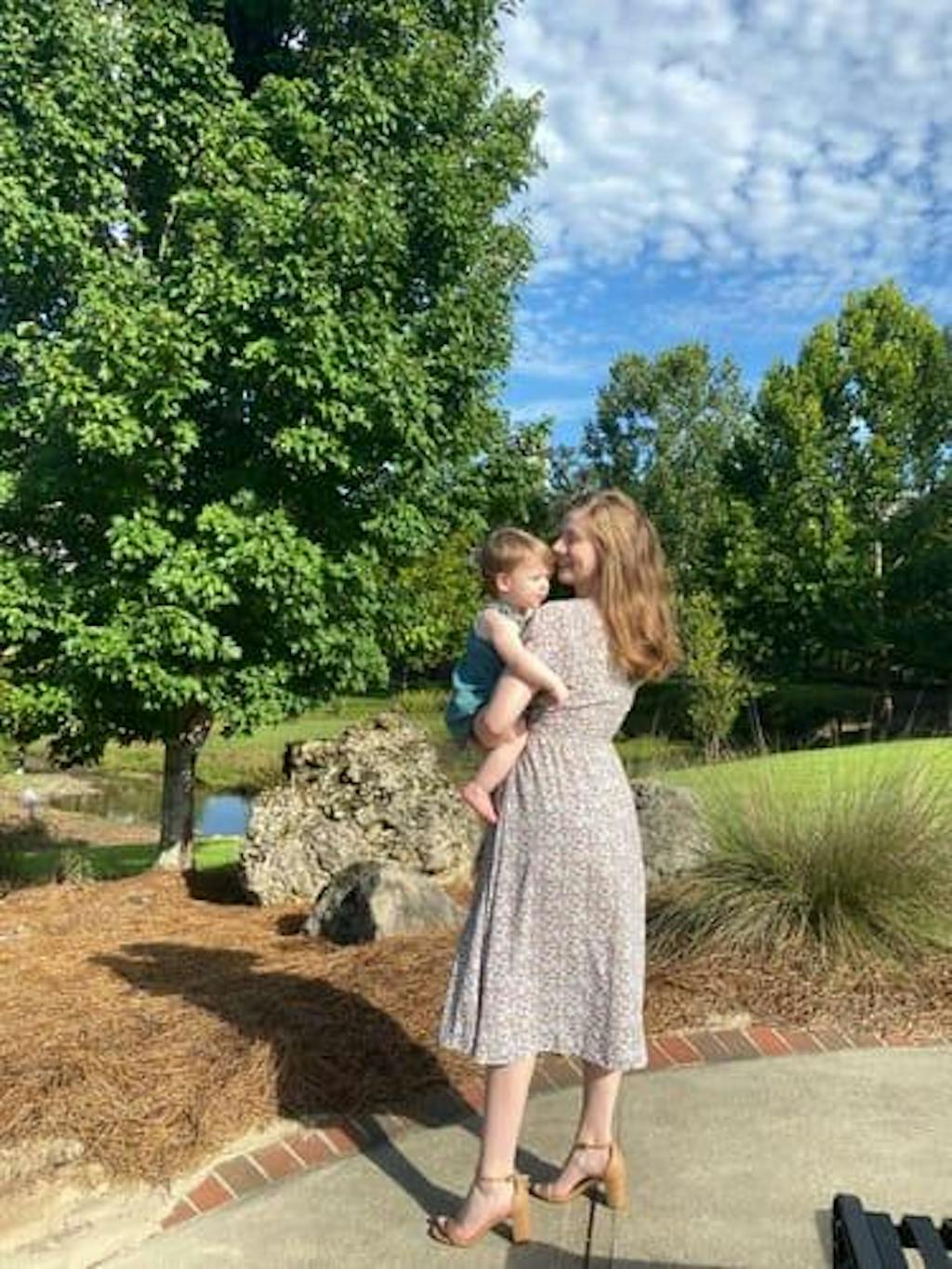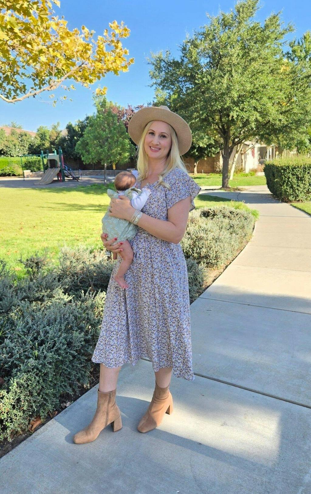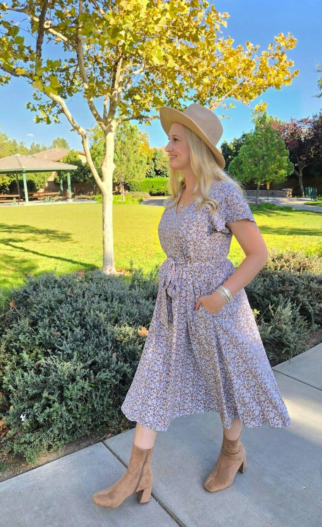 A mom wearing a beige floral belted midi dress with pockets paired with a hat for church or brunch