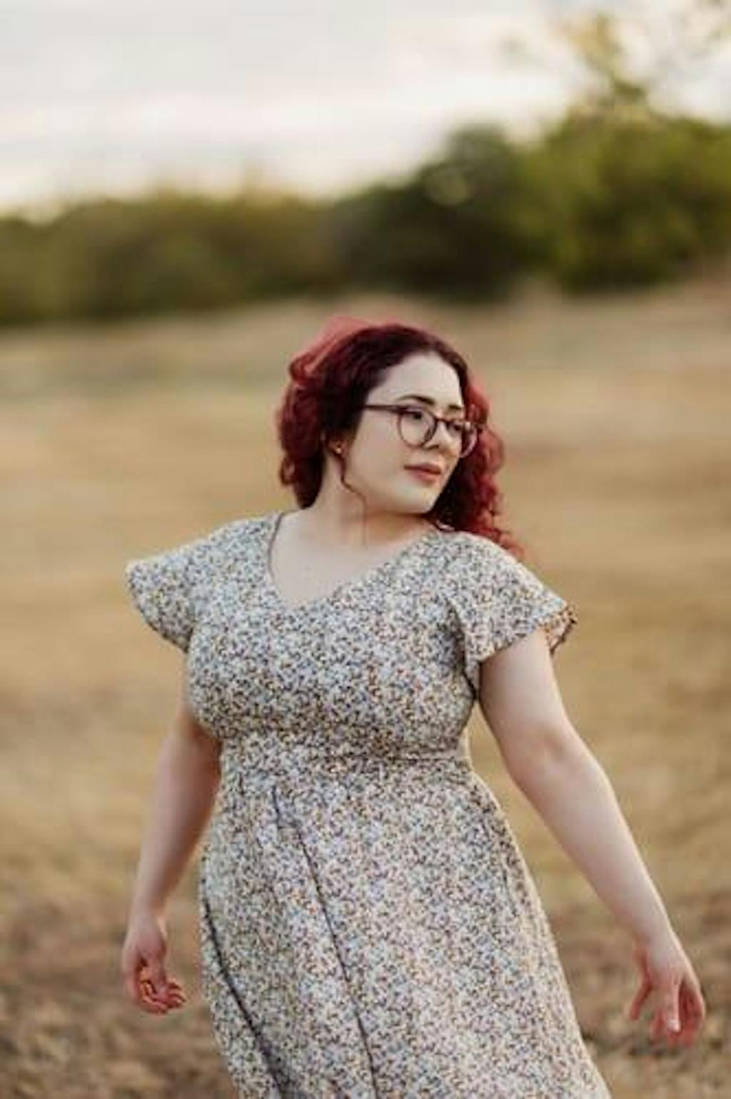 Side view of the beige floral belted midi breastfeeding dress with pockets showing its flowy, relaxed fit for everyday wear.