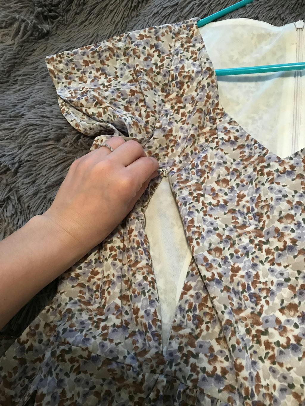 A close-up of the hidden zipper breastfeeding access on the Nursing Queen beige floral belted midi dress highlights the functional design.