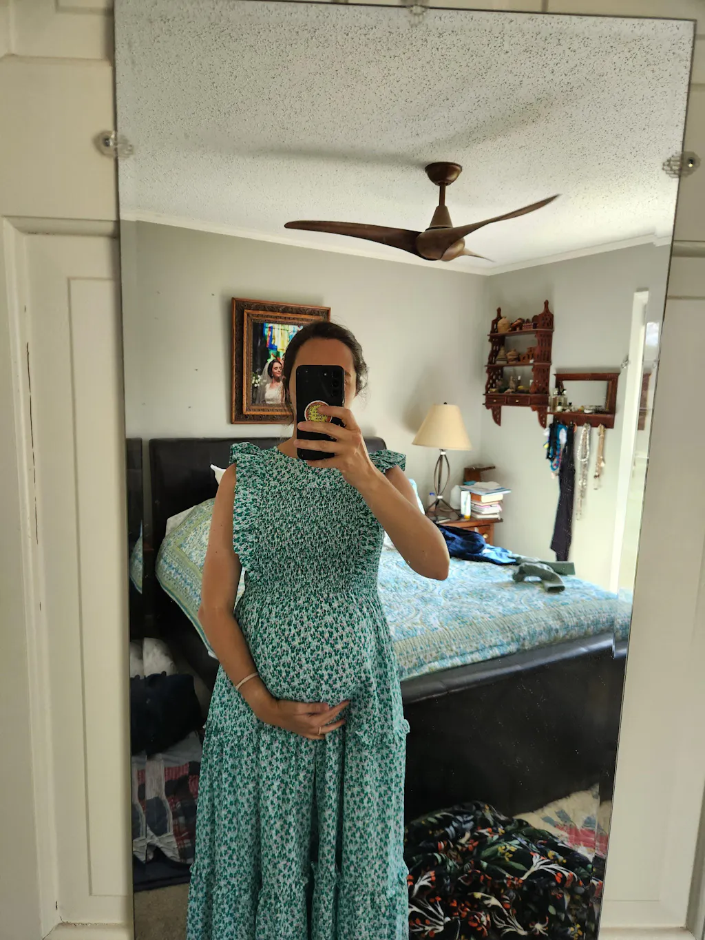 Great fit, color, stretch...received many compliments on this dress! The dress appears blue online, but is actually a green color in person. I still enjoy it, but it definitely was not the color I expected. The smocking in the bust area is wonderful because I really qualify as a M but wanted the rest of the dress to fit properly so I ordered down to a S and the bust still fits. It is snug doing it that way, but still looks good and will "shrink" well with me as my chest size decreases the further out from delivery I get.